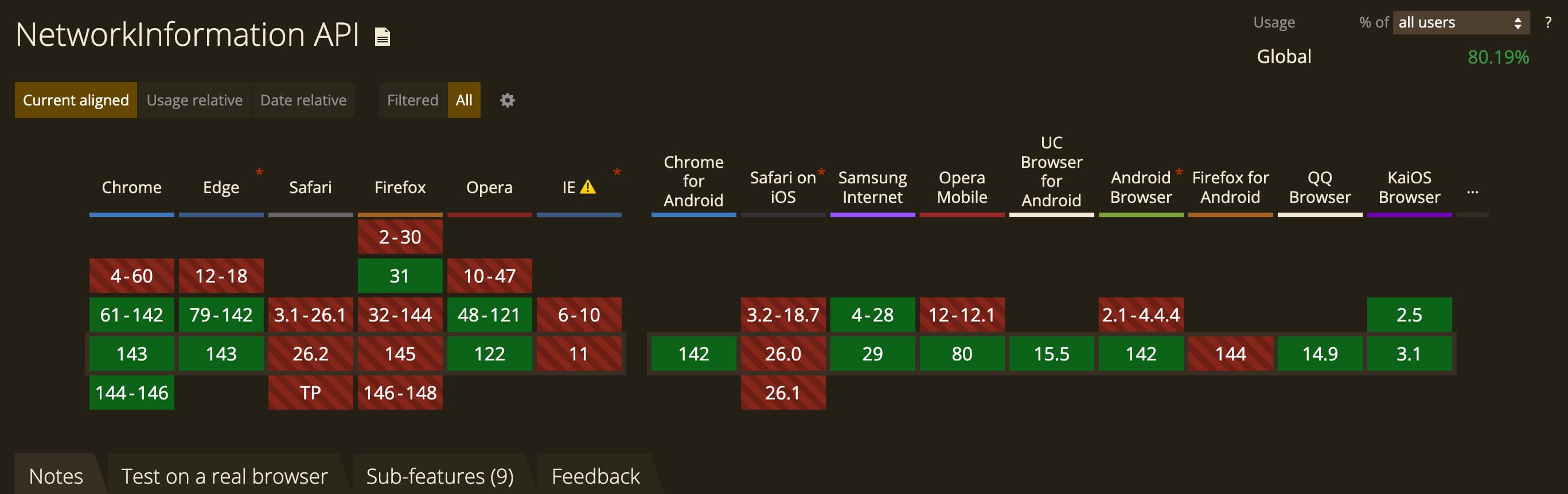 Network Information API доступен не во всех браузерах, и его функции могут варьироваться. В большинстве современных версий Chrome и Edge данное API поддерживается, однако в Safari и Firefox — нет.